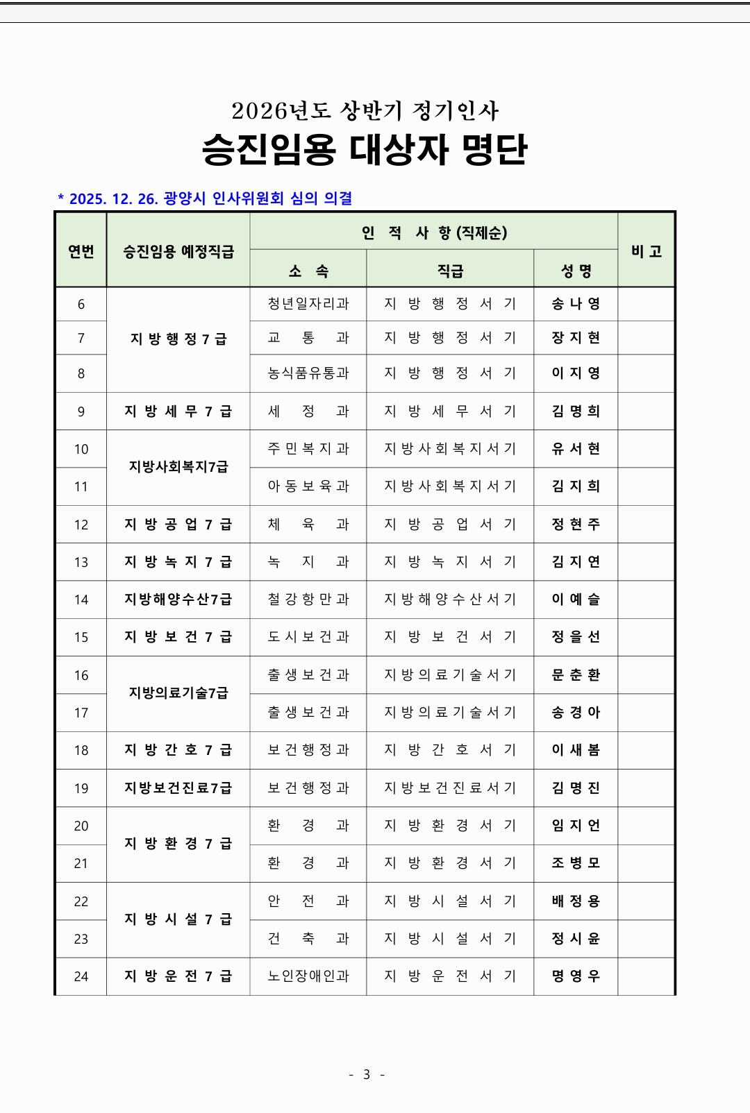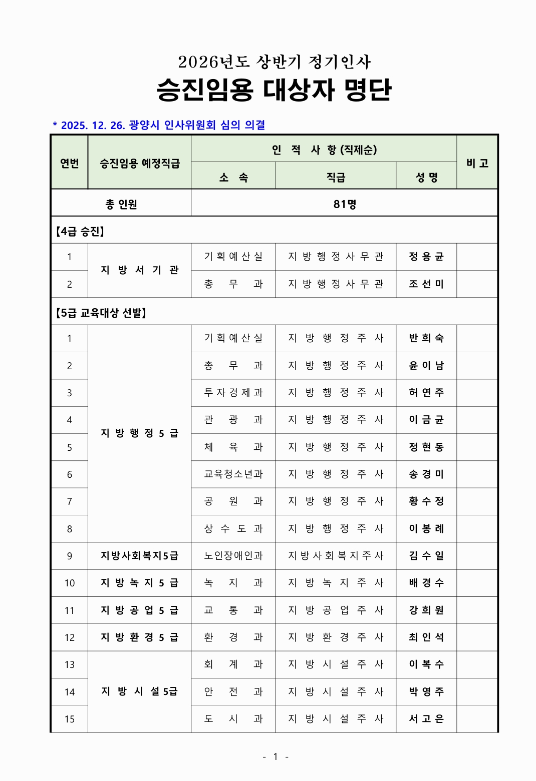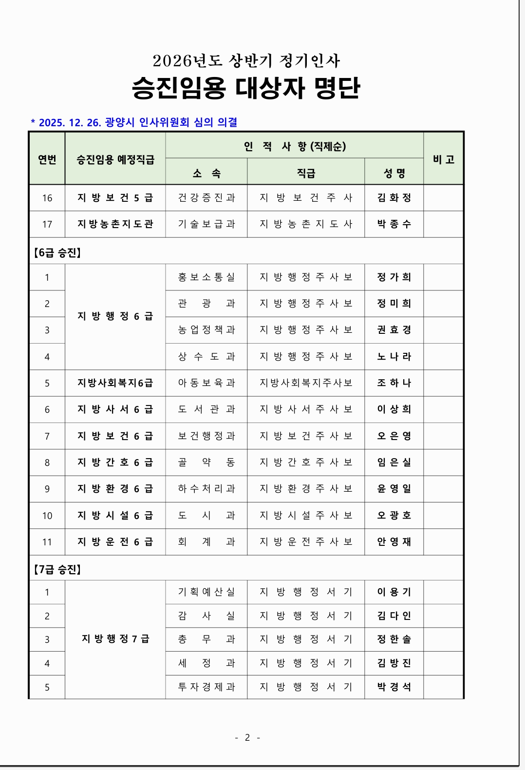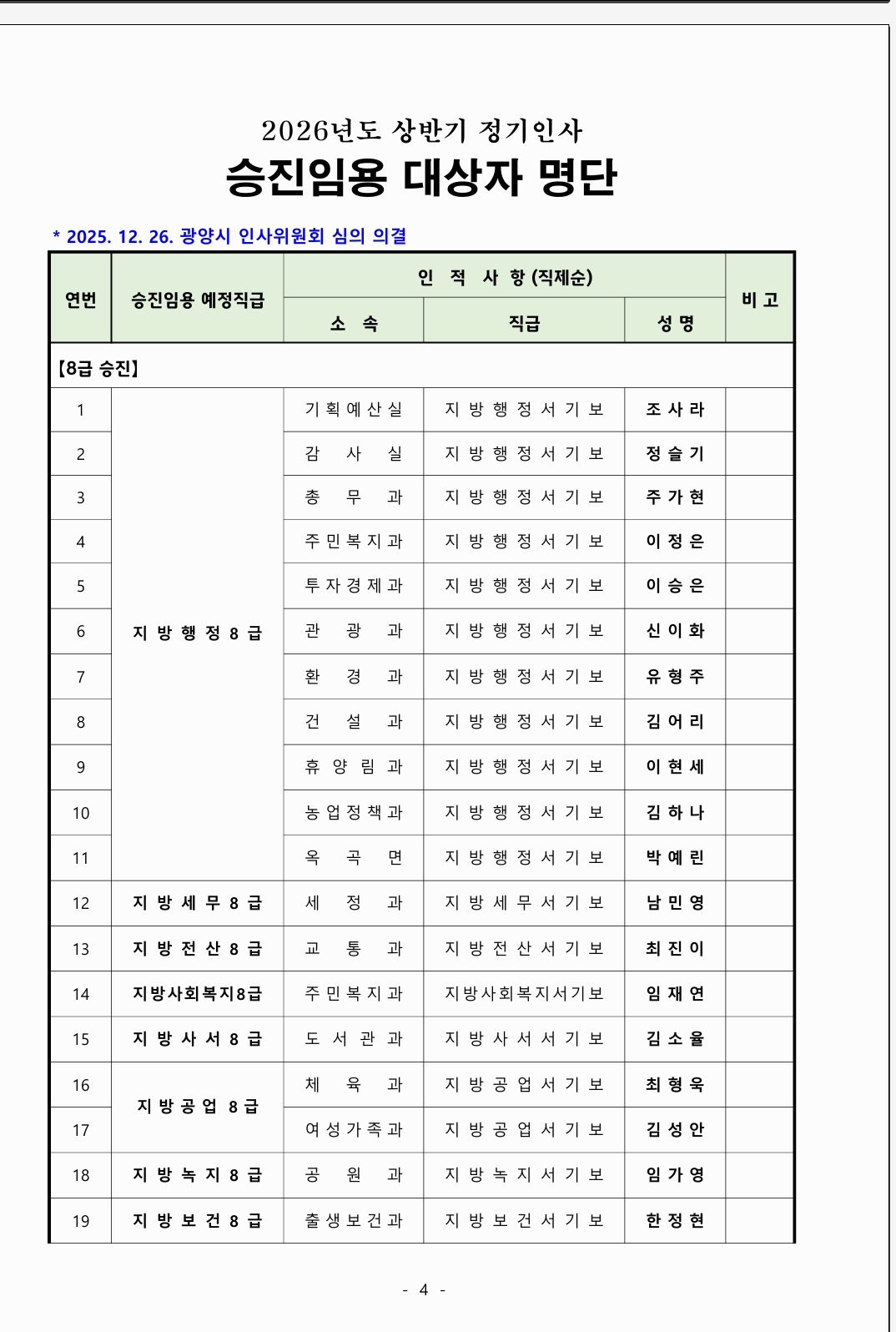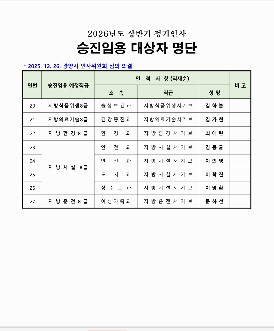 광양시는 오늘(12월26일) 인사위원회를 열고 2026 년도 상반기 승진인사를 발표했다.