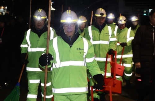김민석 국무총리가 26일 관악구 신림로 일원에서 환경공무관들과 가로 청소 및 청소를 마친 뒤엔 간담회를 하고...