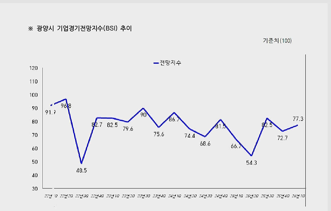 광양상공회의소(회장 우광일)가 지역기업 100여 곳을 대상으로 12월 02일부터 12월 12일까지(휴일제외 9일간) 조사한 ‘2026년 1/4분기 기업경기전망조사' 결과, 기업경기전망지수(BSI : Business Survey Index)’는 77.3P로 집계되었다고 밝혔다.