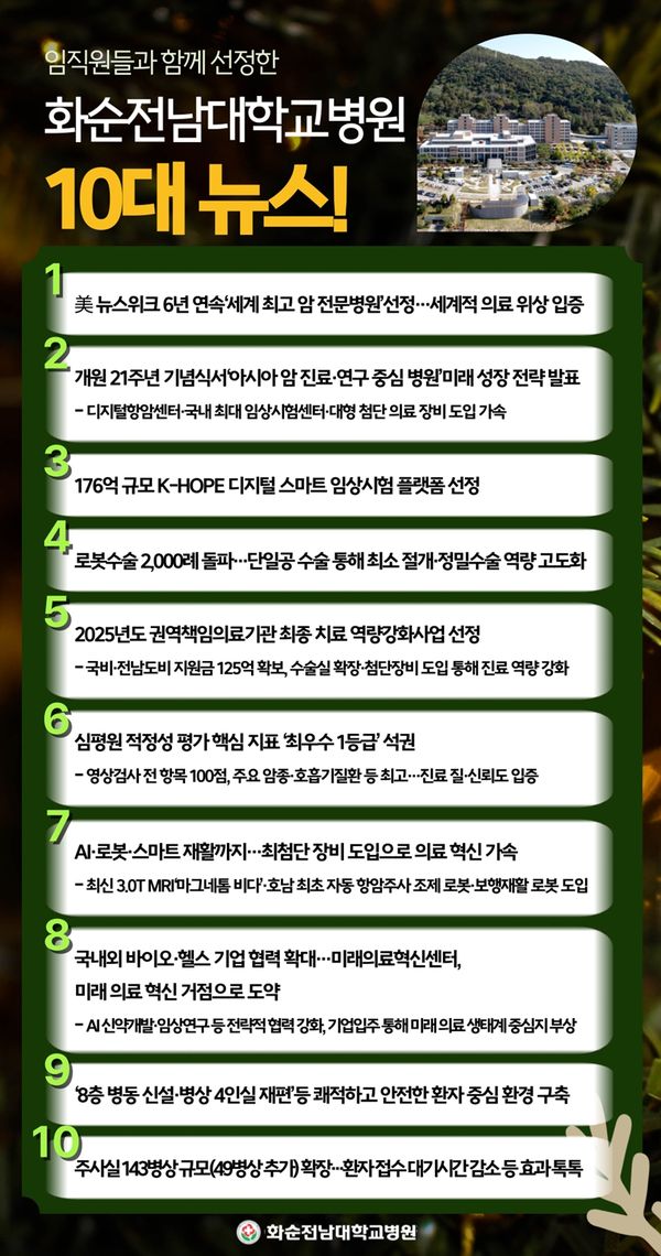 화순전남대학교병원(병원장 민정준)이 2025년 한 해를 마무리하며 병원의 주요 성과를 되돌아보기 위해 전 직원을 대상으로 ‘2025년 최고의 10대 뉴스’ 설문조사를 실시했다.
