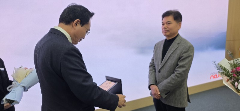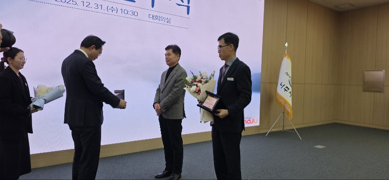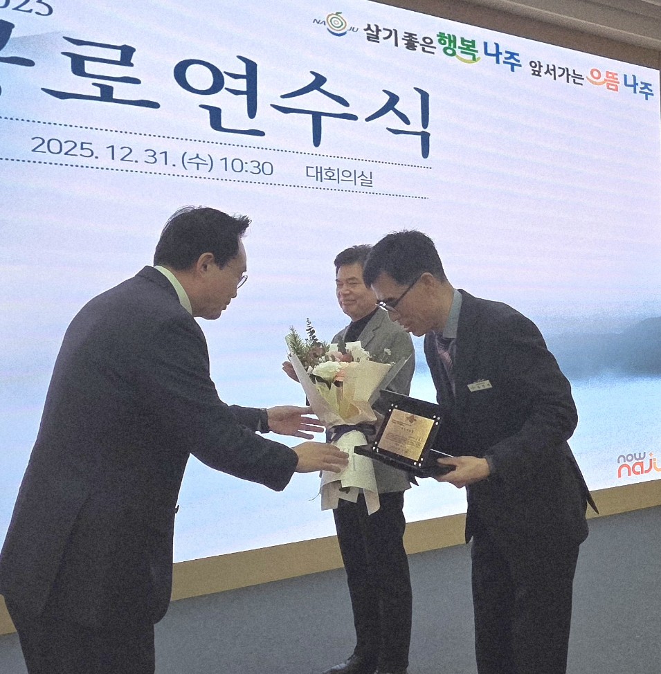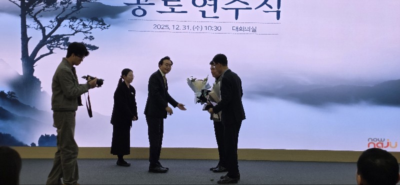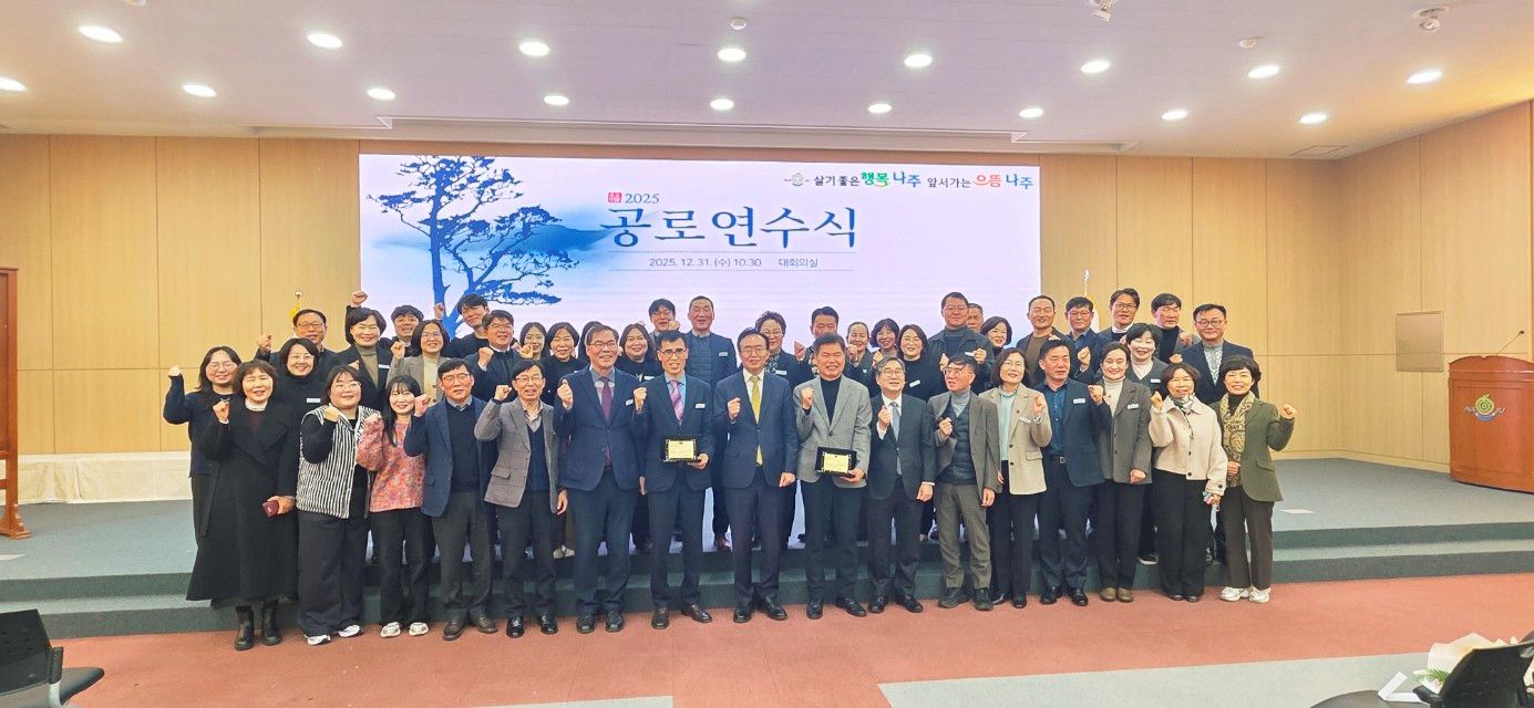 2025.12. 31일 나주시청에서 열린 종무식 및 퇴임식 행사에는 윤병태 나주시장을 비롯한 동료 공직자, 가족들이 참석해 평생을 공직에 몸담아온 이들의 노고를 기리고 앞날을 축복하는 시간을 가졌다.