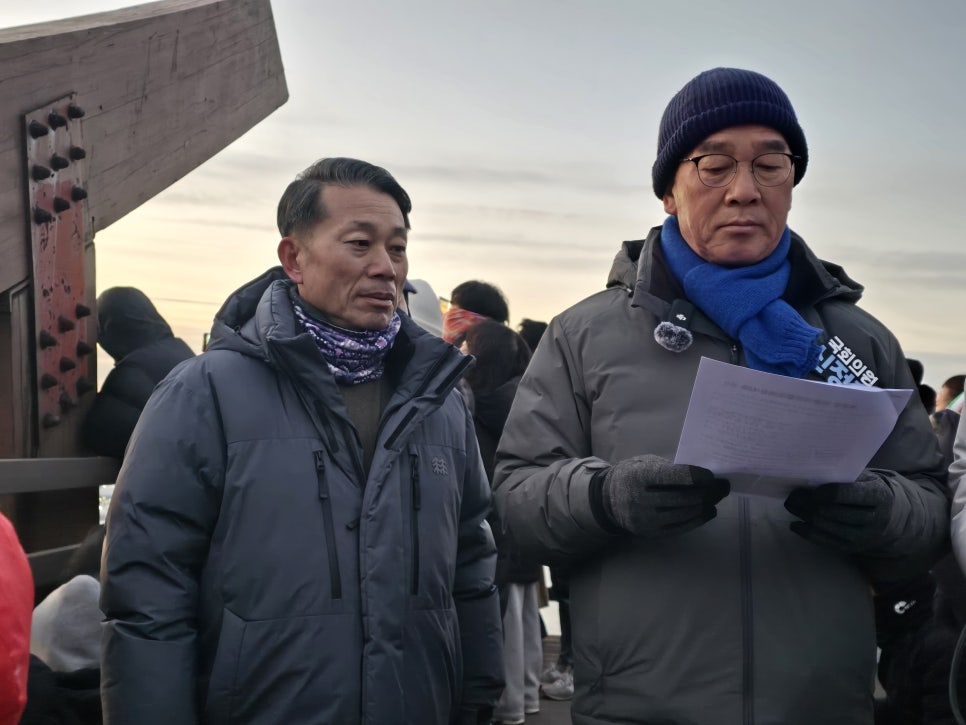 여수 봉화산 정상에서 해돋이를 기다리며 이야기를 나누는 신정훈 위원장과 이재태 의원.