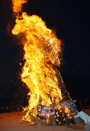 2026년 1월 1일 전남 보성군 율포 솔밭해변에서 열린 해맞이 달집태우기 행사 도중 타오르는 불길 속에서 ...