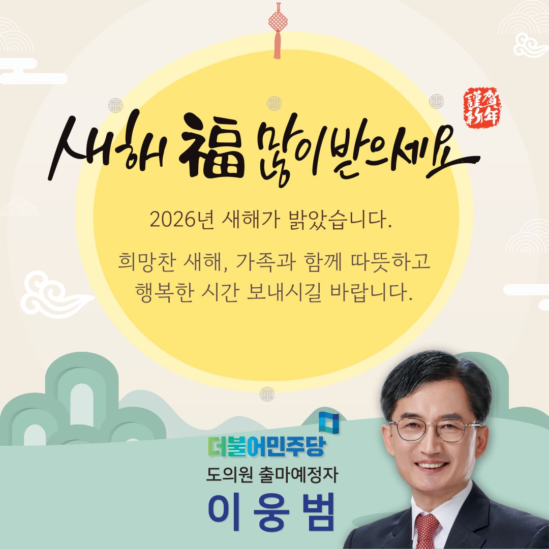 【해륙뉴스1 정치부 = 조경수 기자】 2026년 병오년 새해가 밝았다. 적토마의 해를 맞아 나주 평야에도 새로운 정치적 기운이 감돌고 있다. 더불어민주당 도의원 출마 예정자인 이웅범 예비후보가 시민들에게 새해 덕담을 전하며 본격적인 정치 행보에 나서고 있다.