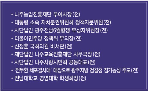 학생 시절 전남대학교 경영대학 학생회장을 맡아 학내 민주주의 실현과 학생 권익을 대변했던 경험은 그가 정치적 소명을 일찍부터 체득했음을 보여준다.