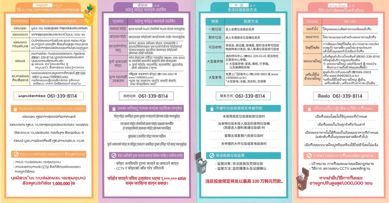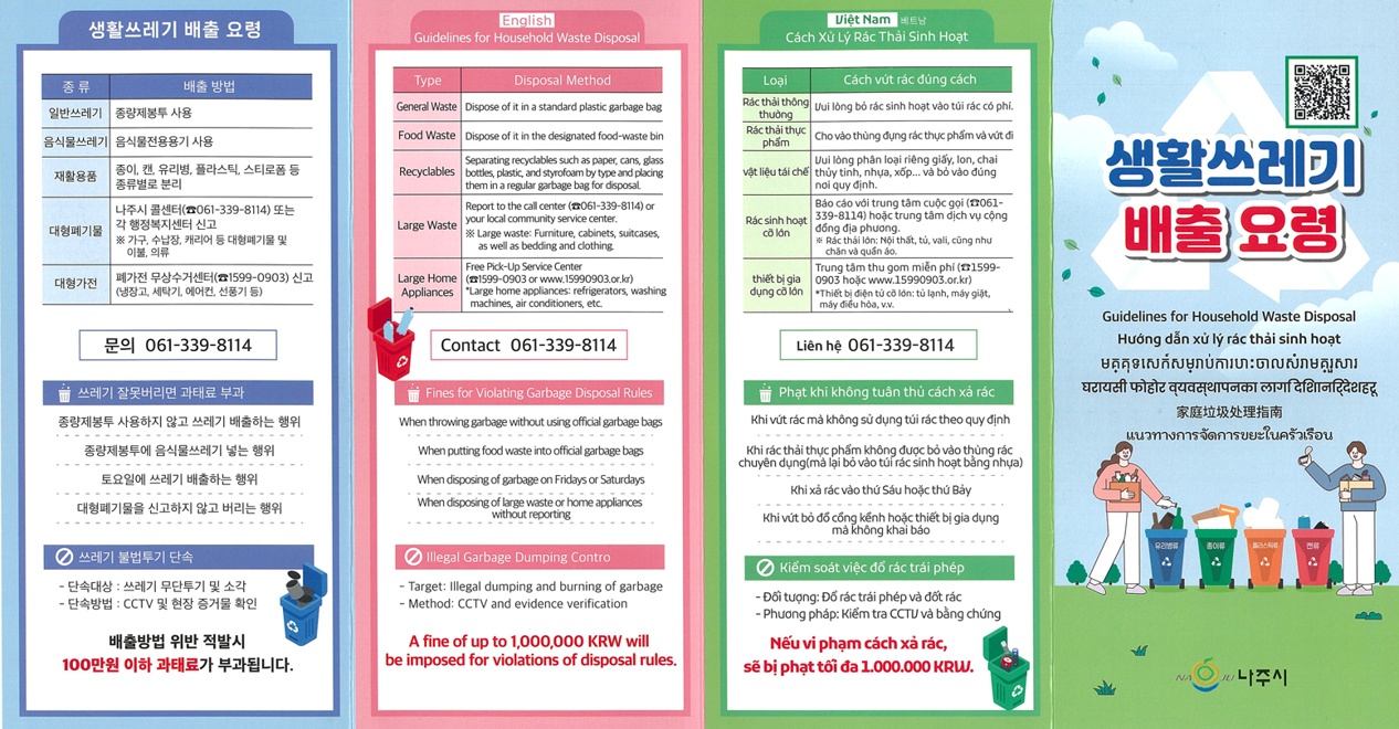 [해륙뉴스1 나주=조경수 기자] 외국인 거주자와 근로자가 생활폐기물 배출 방법을 쉽게 이해하고 올바르게 실천할 수 있도록 나주시가 다국어 홍보물을 제작해 무단투기 예방과 쾌적한 도시환경 조성에 나선다.
