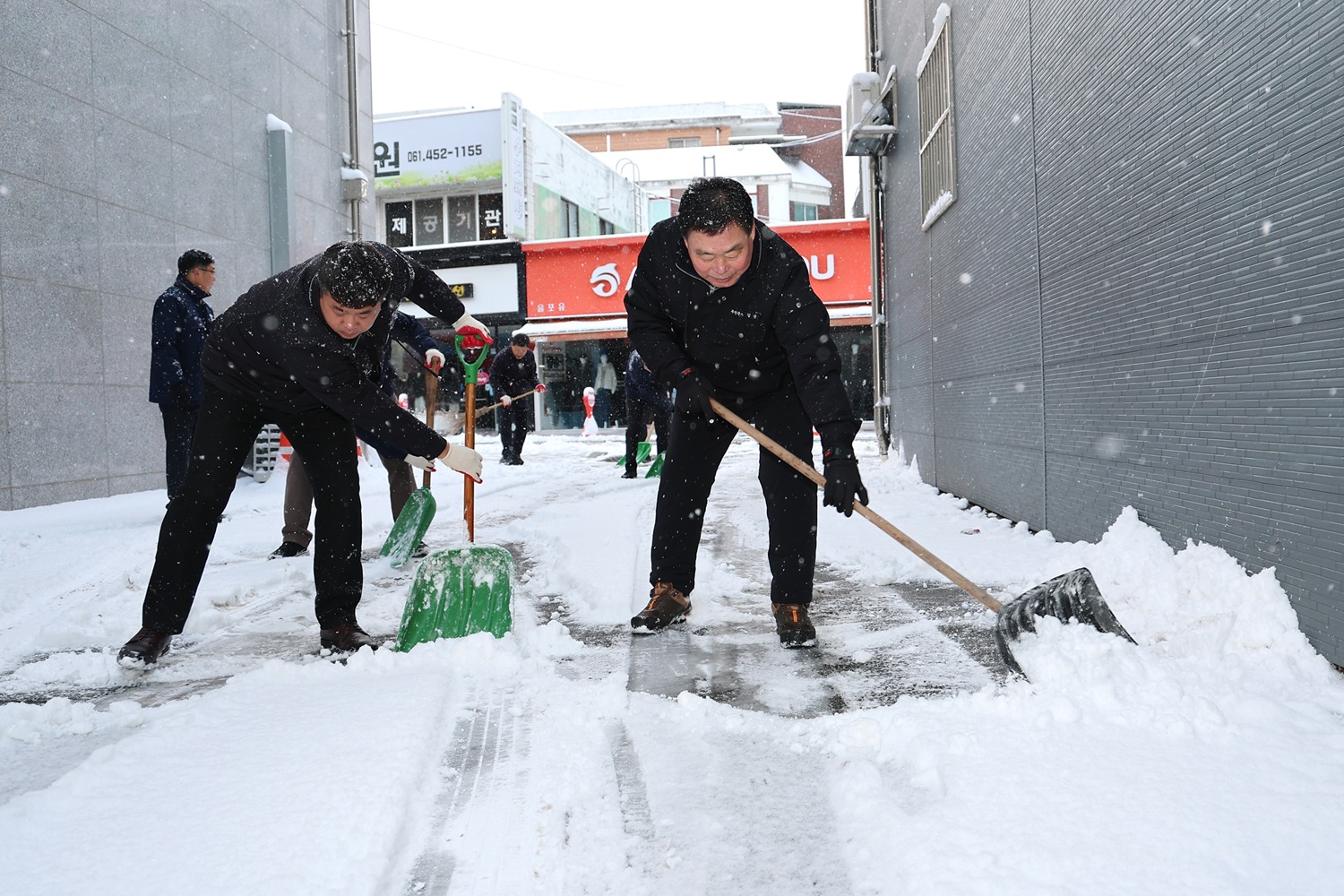 사진설명 김산 군수와 군청 직원들이 무안읍 시가지에서 제설작업에 참여하고 있는 모습(사진제공=무안군)