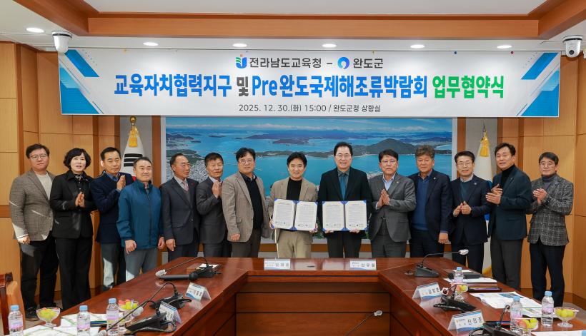 완도군은 지난해 12월 30일 전라남도교육청과 교육자치협력지구의 원활한 사업 운영과 2026 Pre완도국제해조류박람회 협력 체계 구축을 위한 업무 협약을 체결했다.