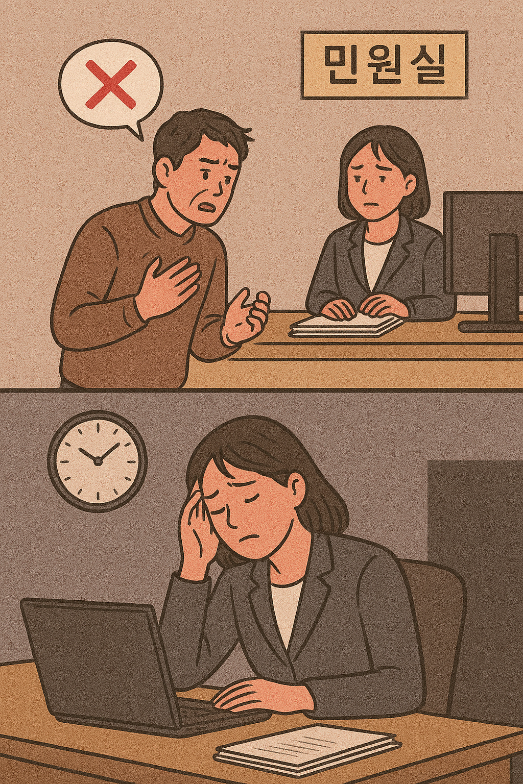 그림은 익일 민원공백으로 답답해 하는 시민들과, 야간 당직으로 청사 방호와 민원업무를 동시에 맡아 이중고를 겪는 여성공직자의 현실을 표현한 장면입니다. (그림 조경수 웹디자이너, 사진 카메라기자)