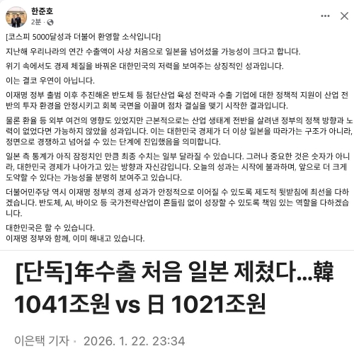 출처: 경기 고양을 한준호의원 페이스북 우리나라의 연간 수출액이 사상 처음으로 일본을 넘어섰을 가능성이 제기...