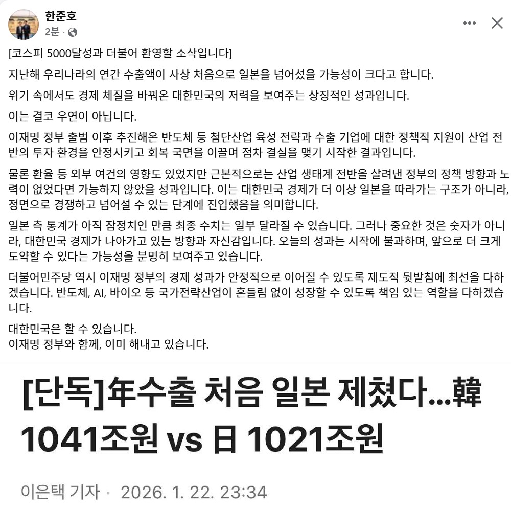 우리나라의 연간 수출액이 사상 처음으로 일본을 넘어섰을 가능성이 제기되며 경제계의 이목이 집중되고 있다. 보도에 따르면 한국의 지난해 연간 수출액은 1041조 원으로, 일본의 1021조 원을 웃돈 것으로 나타났다. 아직 일본 측 통계가 잠정치인 만큼 최종 수치는 일부 조정될 수 있으나, 그 의미는 결코 가볍지 않다.
