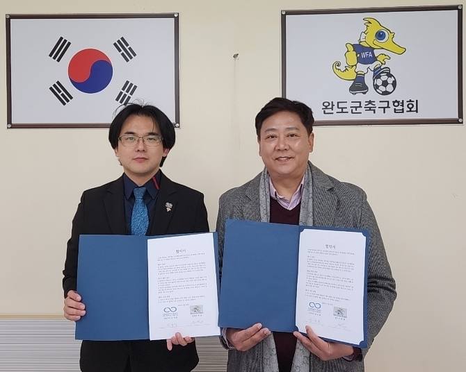 지난 24일 글로벌 에이전트 전문기업 (주)커넥트스페이스 (대표이사 남성화, 하시우)는 전남 완도군축구협회 (협회장 박권)와 실무진 참석하에 협약식을 진행했다.