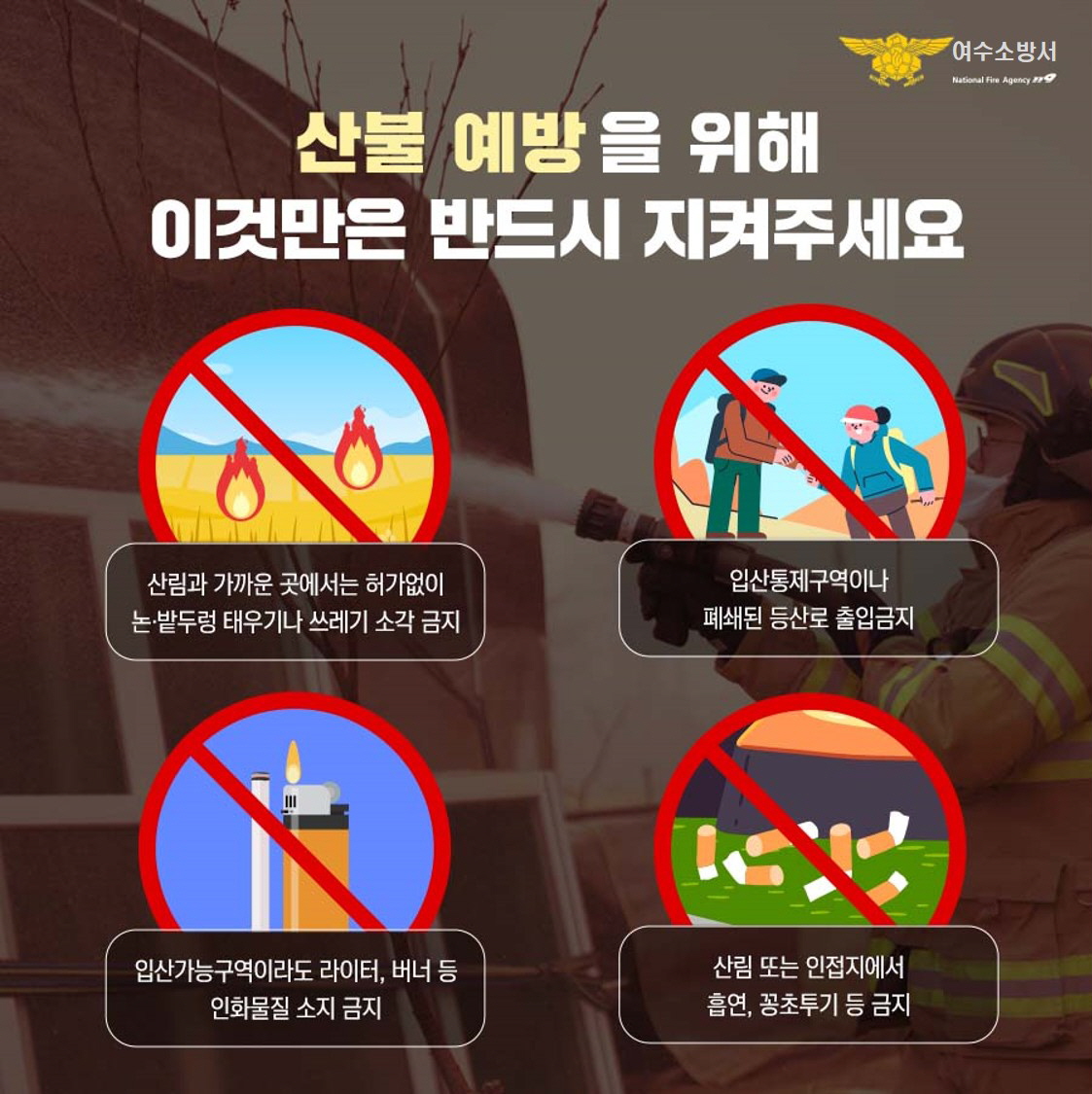 여수소방서는 산불 예방을 위해 시민들에게 다음과 같은 사항을 반드시 지켜줄 것을 당부했다. 주요 내용은 ▲산림과 인접한 지역에서 허가 없는 논·밭두렁 태우기 및 쓰레기 소각 금지 ▲입산통제구역 및 폐쇄된 등산로 출입 금지 ▲입산 가능 구역이라도 라이터, 버너 등 인화물질 소지 금지 ▲산림 또는 인접 지역에서 흡연 및 담배꽁초 투기 금지 등이다.