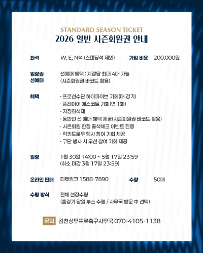 김천상무가 시즌회원, 어린이 시즌회원, 티켓북으로 폭넓은 관람 선택지를 제공한다. 김천상무프로축구단(대표이사...