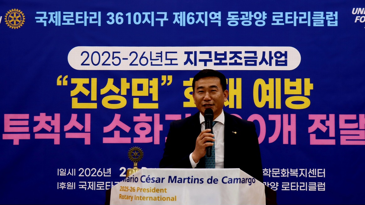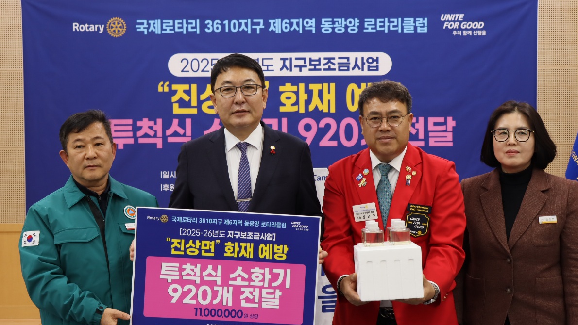 이번 나눔행사는 광양상공회의소 '우광일 회장과 황치환 웅동마을 이장'의 협업으로 마련됐으며 진상면 22개 마을에 '투척용 소화기 920개(22개마을 1,100만 원 상당)가 전달되었다.