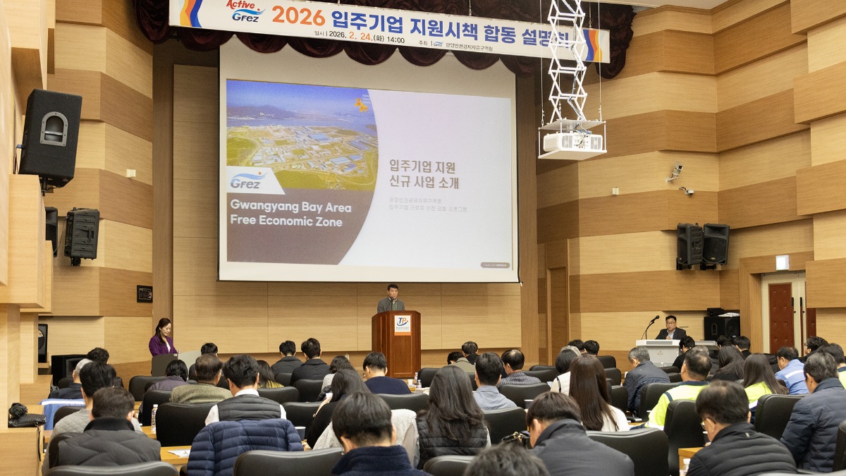 광양만권경제자유구역청(청장 구충곤, 이하 광양경자청)은 24일 전남테크노파크 대강당에서 ‘2026년 입주기업 지원시책 합동 설명회’를 개최하고, 광양만권 입주기업을 대상으로 한 분야별 지원정책을 종합 안내했다고 밝혔다.