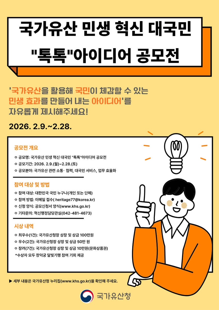 국가유산청(청장 허민)은 2월 9일부터 2월 28일까지 국가유산을 활용해 국민 삶의 질을 높이는 민생형 정책을 발굴하기 위한 「국가유산 민생 혁신 대국민 “톡톡” 아이디어 공모전」을 개최한다.