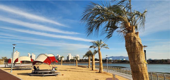 해변에는 28그루의 야자수가 식재돼 이국적인 분위기를 자아내며, 캐노피와 파고라 등 휴식 시설이 설치돼 체류 여건을 높였다. 특히 조수간만의 차에 따라 갯벌과 수면이 드러나는 광양만 특유의 풍경은 낮과 밤 전혀 다른 분위기를 연출한다.