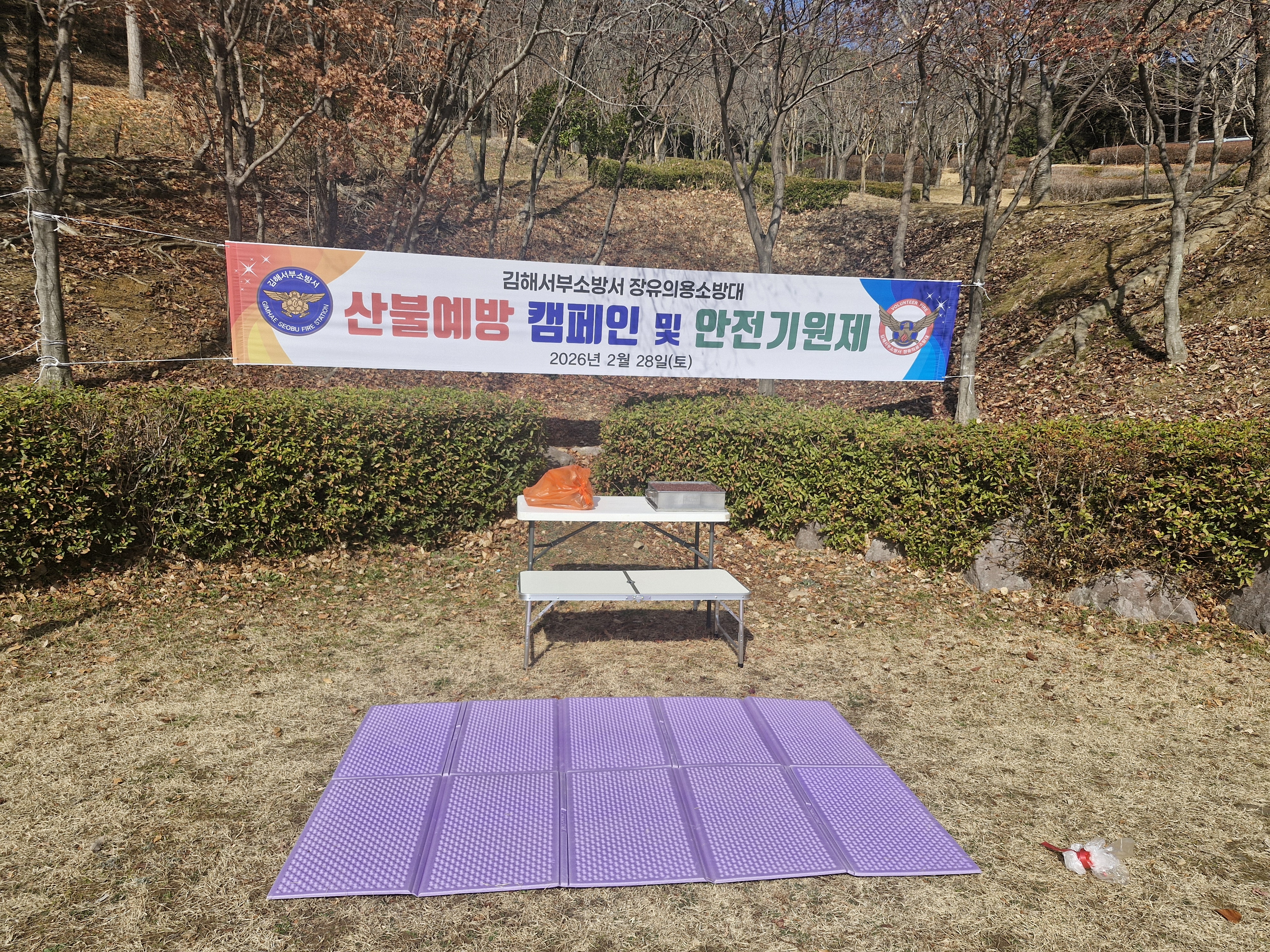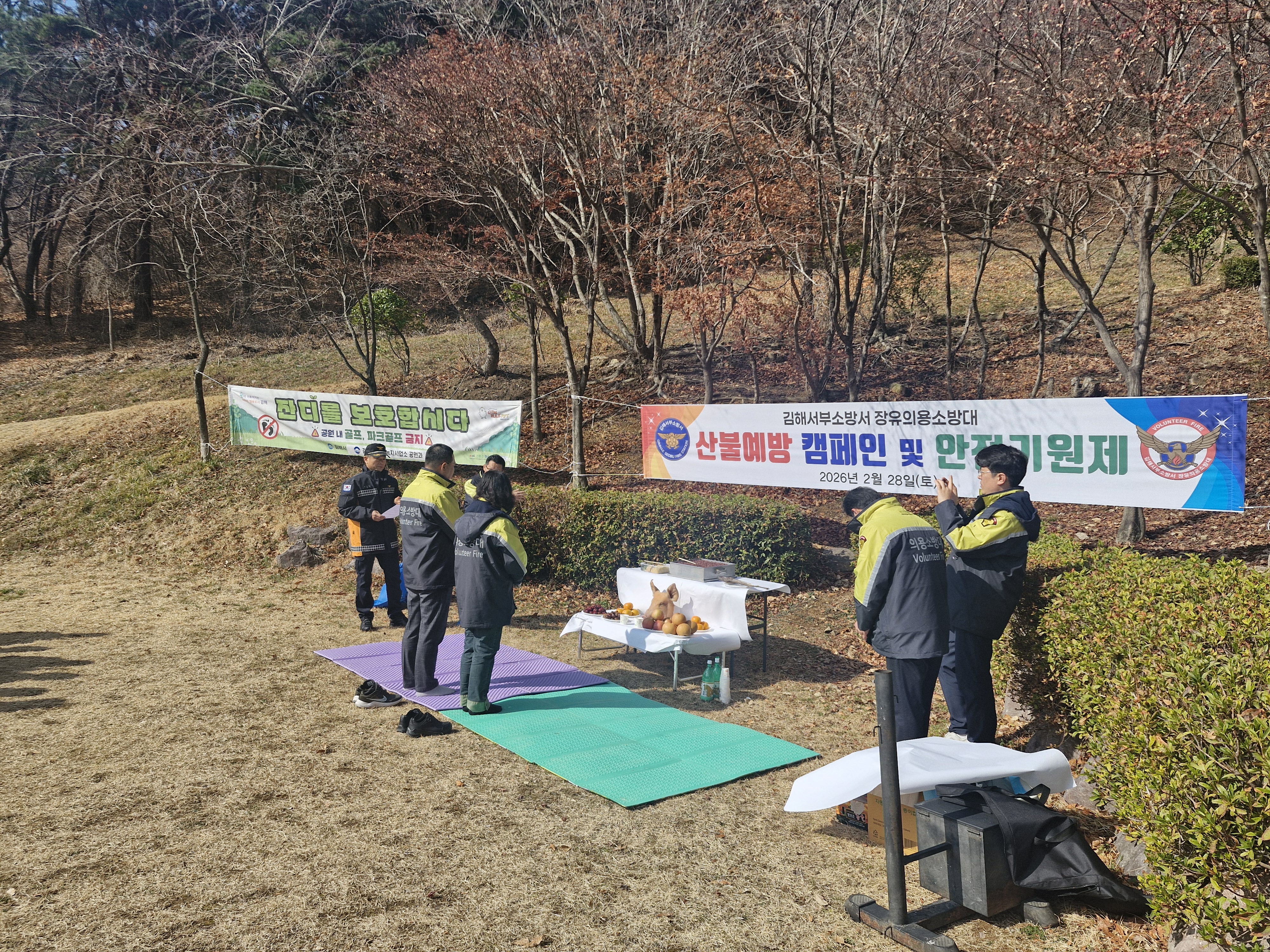 2026년 장유의용소방대 산불예방 캠페인 및 안전기원제가 장유 반룡산 입구에서 실시되었다