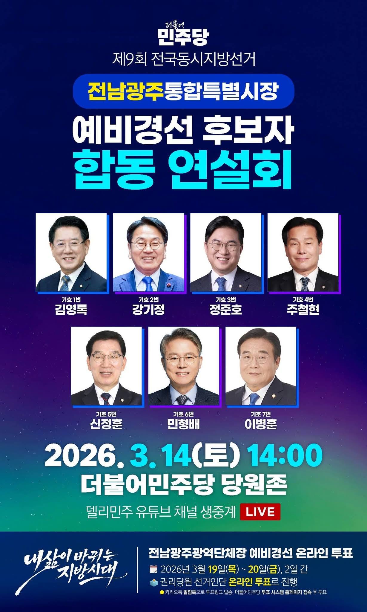더불어민주당은 3월 14일 오후 2시 당원존에서 전남광주통합특별시장 예비경선 후보 합동연설회를 진행한다. 행사에는 기호 1번 김영록, 기호 2번 강기정, 기호 3번 정준호, 기호 4번 주철현, 기호 5번 신정훈, 기호 6번 민형배, 기호 7번 이병훈 후보가 참여해 각자의 정책 비전과 지역 발전 전략을 제시할 예정이다.