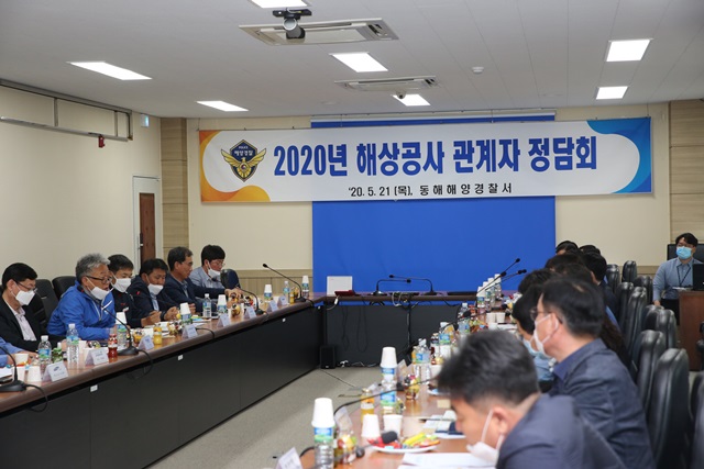 동해해양경찰서(서장 권오성) 21일 동해해경 3층 소회의실에서 관내 대규모 해상공사* 진행에 따라 증가하는 해상작업선의 안전사고 예방을 위한 ‘해상공사 관계자 정담회’를 실시했다고 밝혔다.