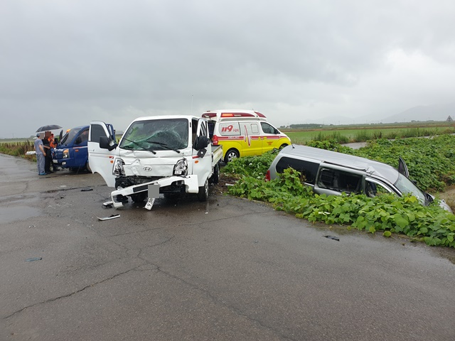 18일 오전 10시 53분경 고흥군 풍양면 당두리 공호마을 앞 고흥만간척지 농로 교차지점에서 빗길 속을 운행하던 스타렉스 숭합차와 포터트럭이 충돌했다.