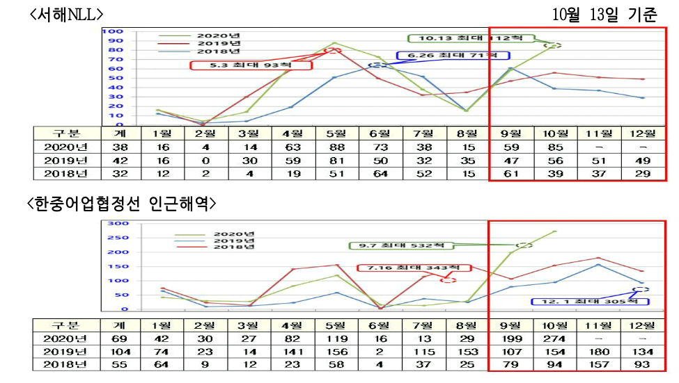 10월 13일에는 NLL해역에 최대 112척이 출현했다. 이는 2016년 10월 이후 4년 만에 110척 이상 출현하는 등 NLL해역에서의 외국어선 출현이 급증하고 있는 상황이다.