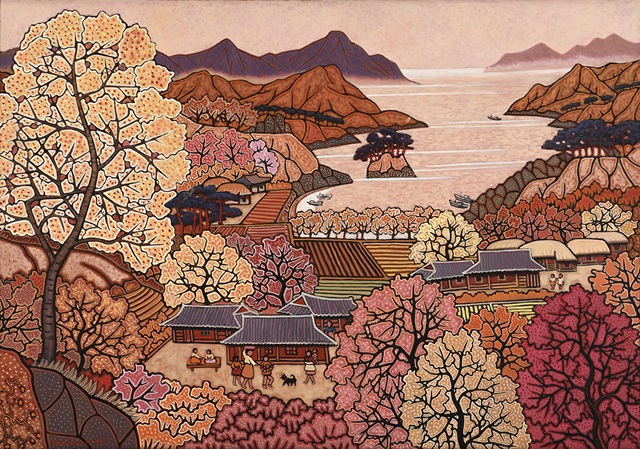 □이한우 화백은 한국화의 기법 위에 서양화의 토착화를 시도한 독보적 화풍의 소유자로, 한국의 산하와 한민족의 서정을 독특한 시선과 화사하고 깊은 색조로 표현한 ‘아름다운 우리 강산’ 시리즈를 통해 세계적인 명성을 자랑하는 원로 작가이다. 그는 작가 노트에서 자신의 작업이 동양의 합리주의와 인본주의에 의한 조형 활동임을 강조한다. 고향 풍경을 배경으로 기와집과 초가집이 옹기종기 모여있고 사람들과 가축들이 한가롭게 어우러져 있는 작품 속 정겨운 화면이 우리에게 평화로움과 잔잔한 감동을 주는 이유이다.