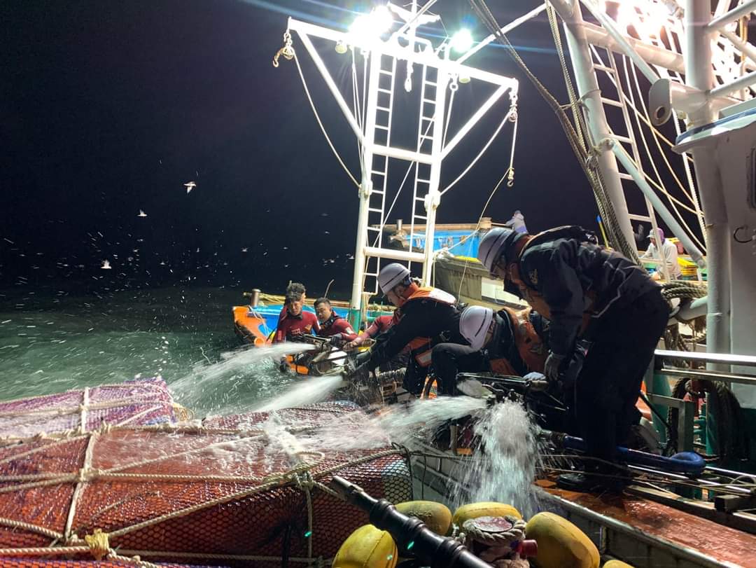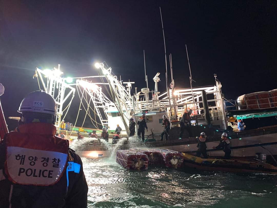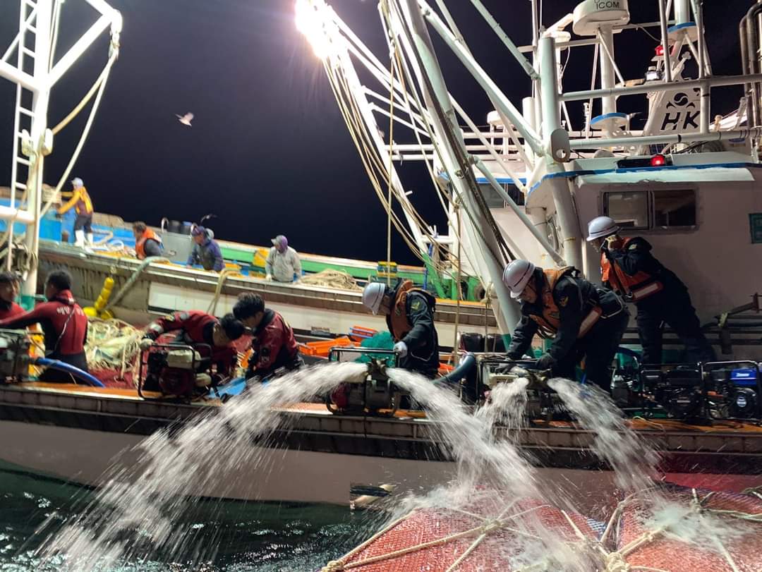 해경은 배에 남아 선박 상태를 점검할 선장과 기관장 등 3명을 제외하고 남은 선원 2명은 구조대 선박으로 대피시킨 후, 물이 차오르고 있는 어선에 남아 물을 밖으로 배출하는 배수 작업에 들어갔다.