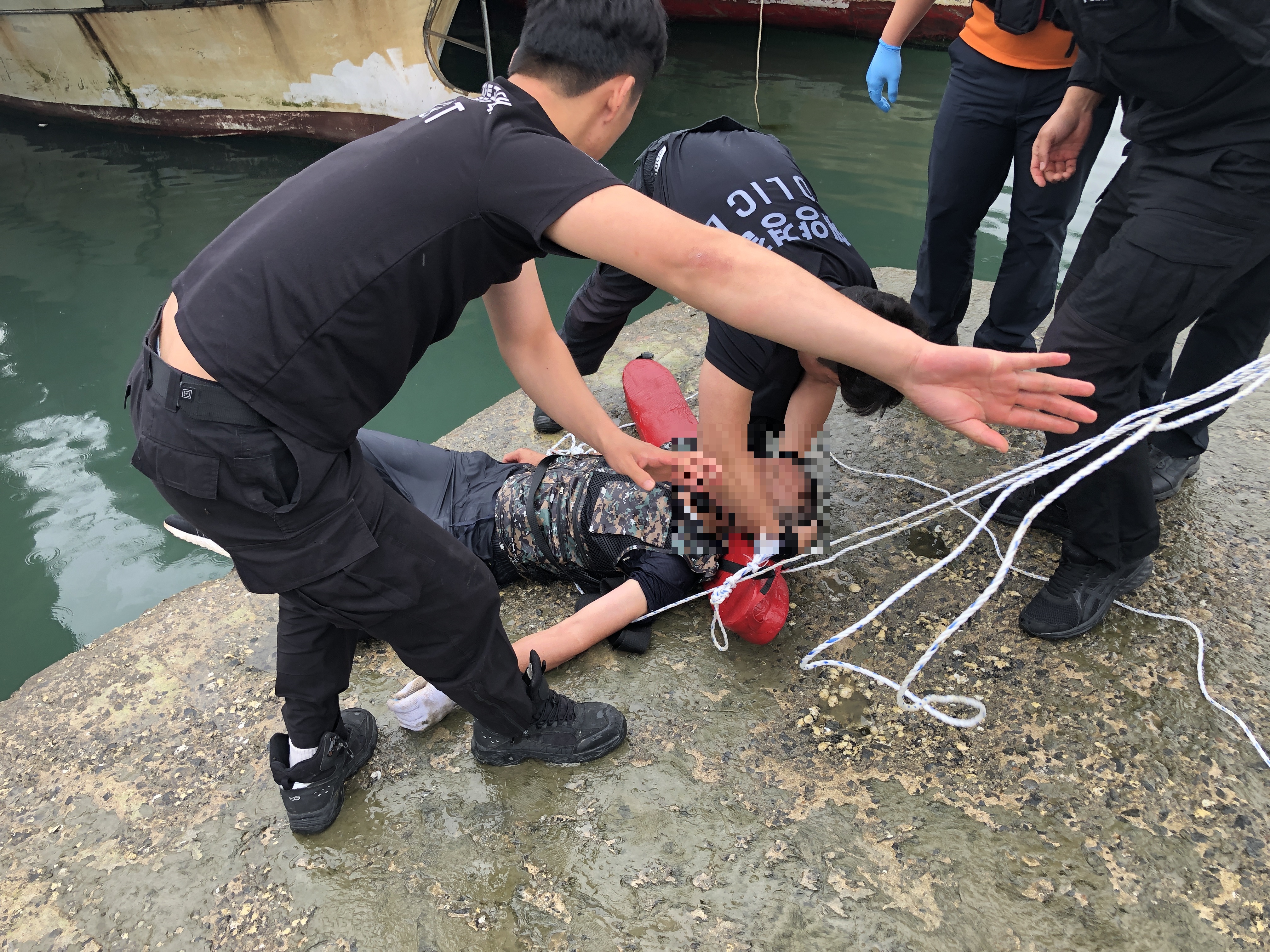 신고접수를 받은 상황실은 구조대를 현장에 급파하여 긴급구조에 나섰다. 현장 확인결과 A씨는 추락 한 곳에서 어선의 줄을 잡고 있었으며 출동한 구조대에 의해 구조되었다.