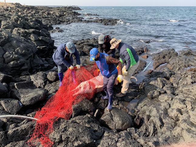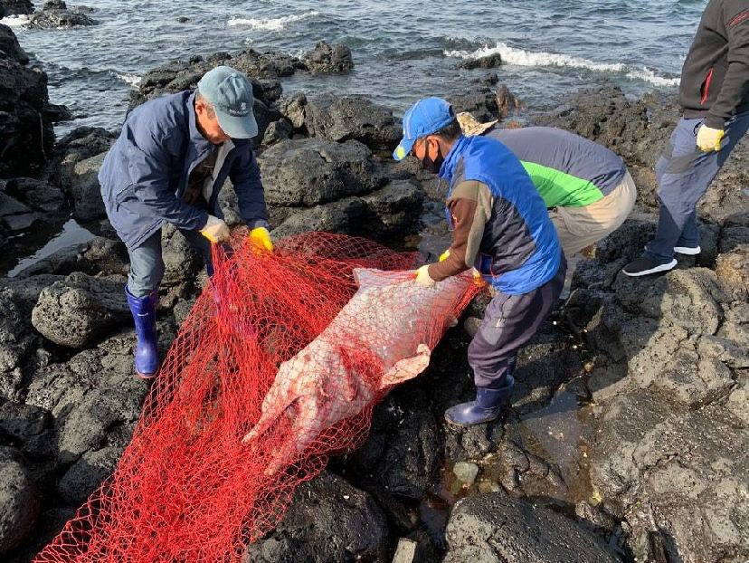 어제 오후 제주시 김녕항 바위 사이에서 죽은 지 10일 이상 된 남방 큰 돌고래를 발견하여 지자체인 구좌읍사무소에 인계하였다고 밝혔다.