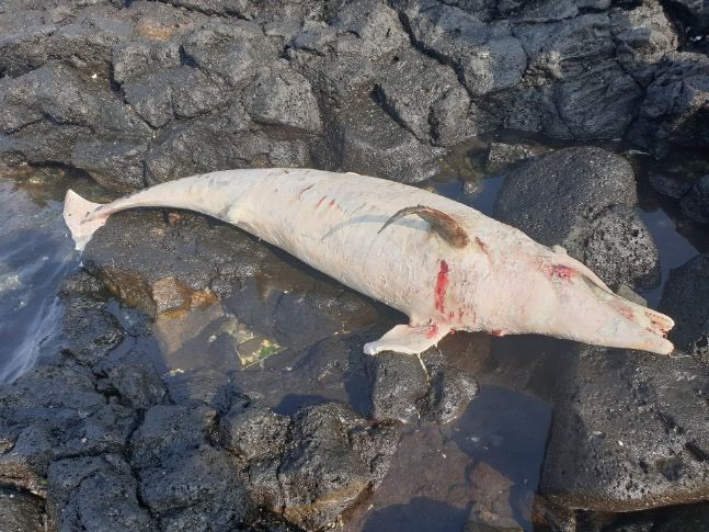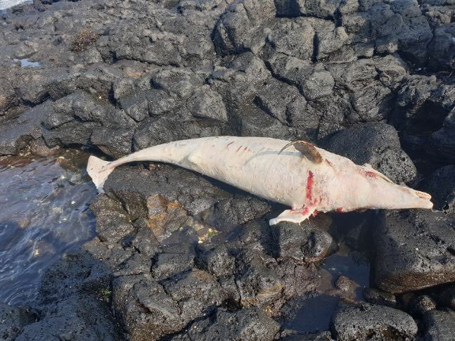 어제(2일) 오후 1시4분경 제주시 구좌읍 김녕 인근 바위 사이에서 죽은 남방 큰 돌고래로 인해 악취가 심하다는 신고를 접수하고 1시5분경 현장 도착 고래연구센타에 사진을 전송한바 몸무게 150kg 정도에 길이 약 250cm, 폭 60cm의 수컷 남방 큰 돌고래로 부패한지 약 10일 이상일 것으로 추정된다고 확인하였다.
