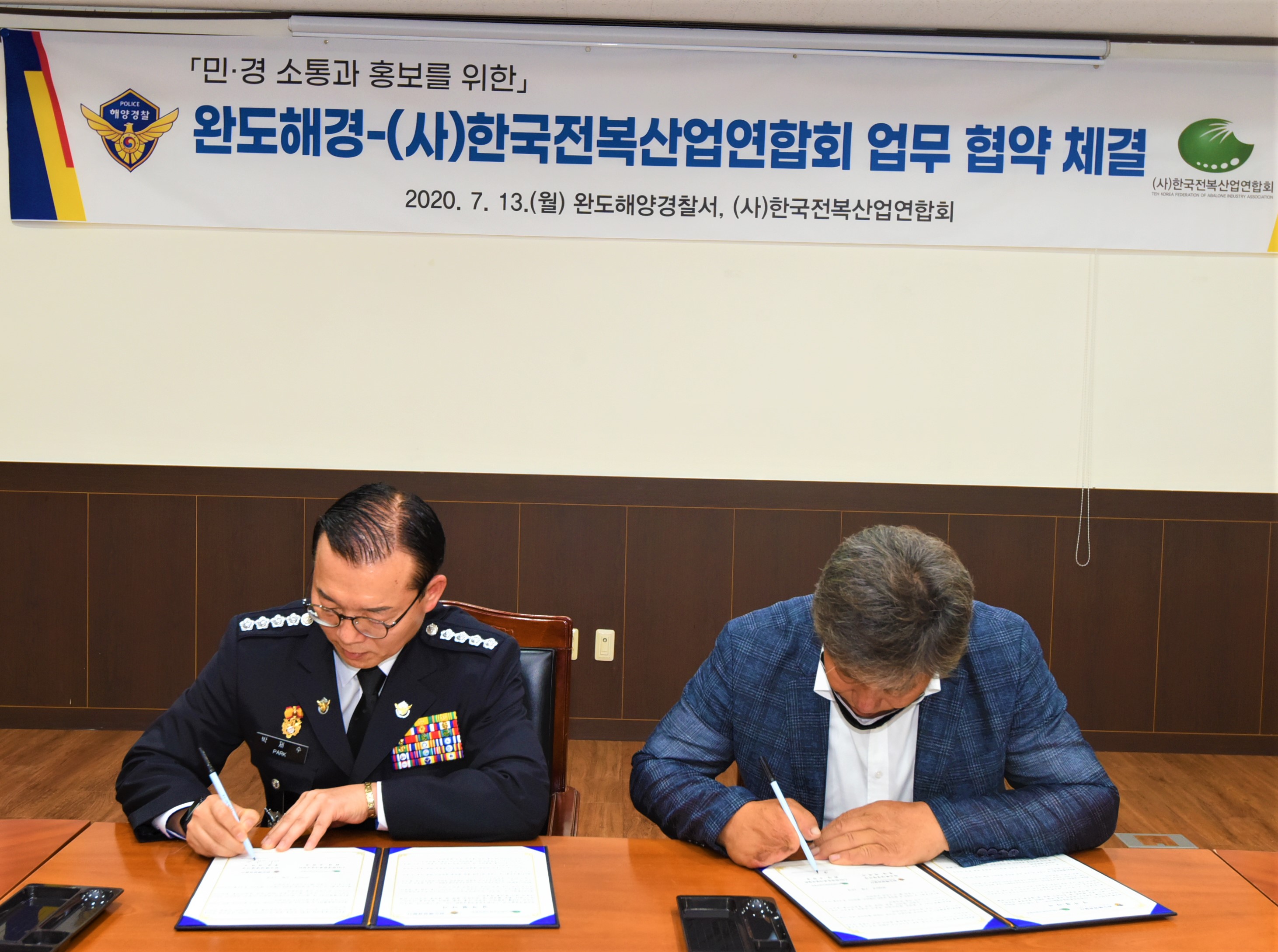 완도해양경찰서(서장 박제수)는 지난 13일 3층 영상회의실에서 민․경 소통과 화합으로 지역경제 상생과 협력‧발전 마련을 위해 (사)한국전복 산업 연합회와 업무 협약을 체결했다고 밝혔다.
