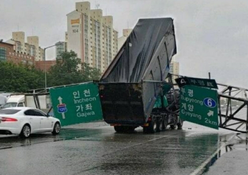 [양칠송 기자]=경인고속도로 표지판 파손으로 차량통제로 정체... - 적재함 들어올린채 달리던 곡물 수송 화...