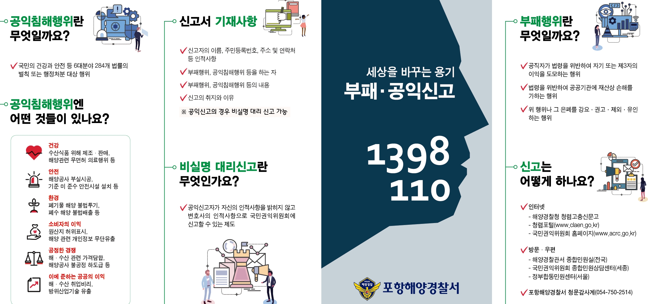 포항해양경찰서(서장 이영호)는 청렴문화 확산과 공익·부패 신고 활성화를 위해‘세상을 바꾸는 용기 부패·공익신고 1398또는110’리플렛을 제작·배포한다고 밝혔다.