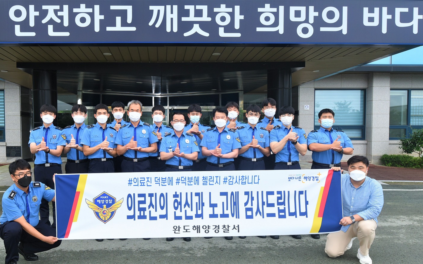 완도해양경찰서(서장 박제수)는 지난 22일 코로나19극복을 위해 헌신하고 있는 의료진에게 감사와 존경의 마음과 응원의 메시지를 전하는 ‘덕분에 챌린지’에 동참했다.
