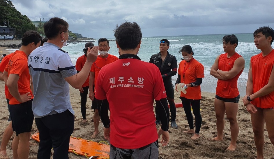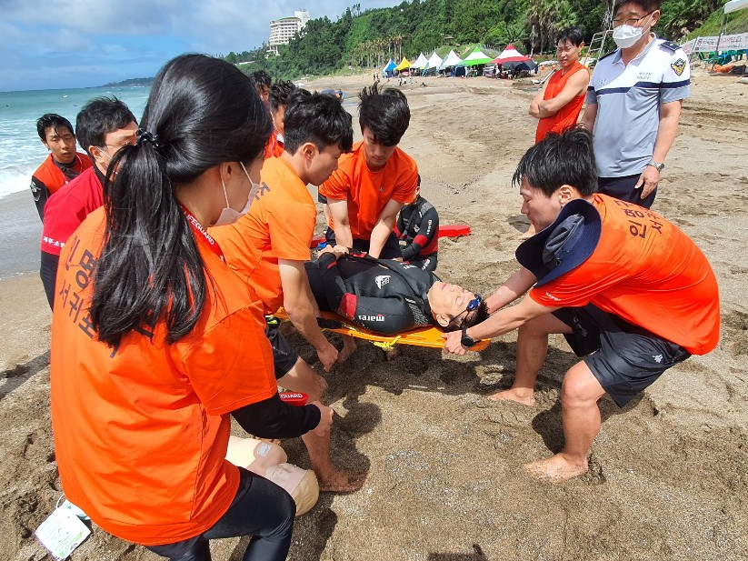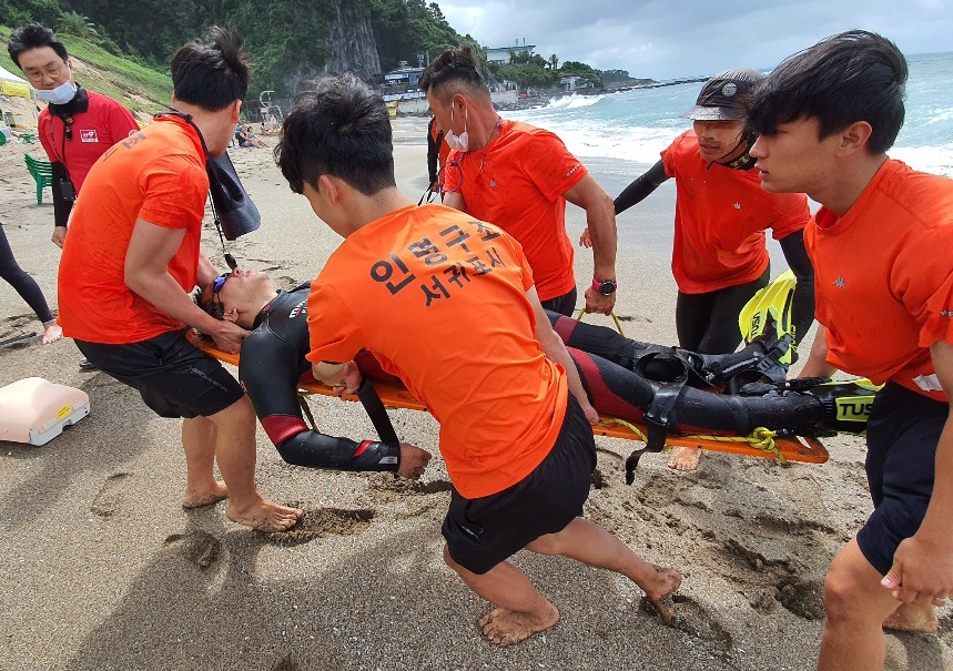 서귀포해양경찰서(서장 도기범)는 여름 휴가철 서귀포 관내 해수욕장을 찾는 관광객이 급증할 것으로 예상됨에 따라, 해수욕장 물놀이 사고 등 연안해역 구조역량 강화를 위해 24일 중문해수욕장에서 불시 민·관 합동 훈련을 실시하였다고 밝혔다.