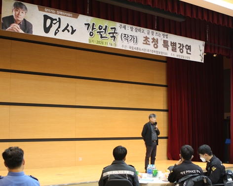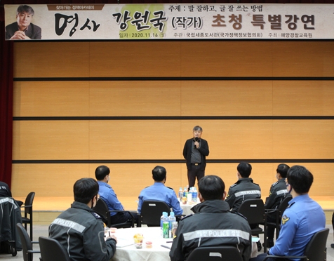 해양경찰교육원(원장 고명석)은 16일 교육원 중강당에서 교직원과 신임경찰 등 50여 명이 참석한 가운데, 글쓰기 능력 향상을 위해 「대통령의 글쓰기」저자인 강원국 작가를 초청해 특별 강연회를 가졌다.