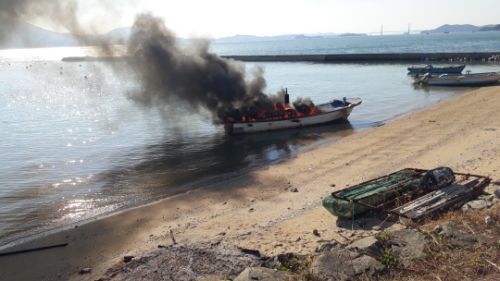 사진 설명 - 지난 5일 오후 1시 46분경 전남 고흥군 도양읍의 한 해안에서 정박중이던 선박에서 불이났다....