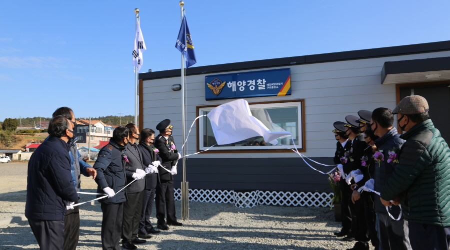▲ 태안해양경찰서 윤태연 서장(왼쪽 앞쪽)과 지역민 대표자들이 신설된 구도출장소 현판 제막식에 참석하고 있다. / 출처=태안해양경찰서
