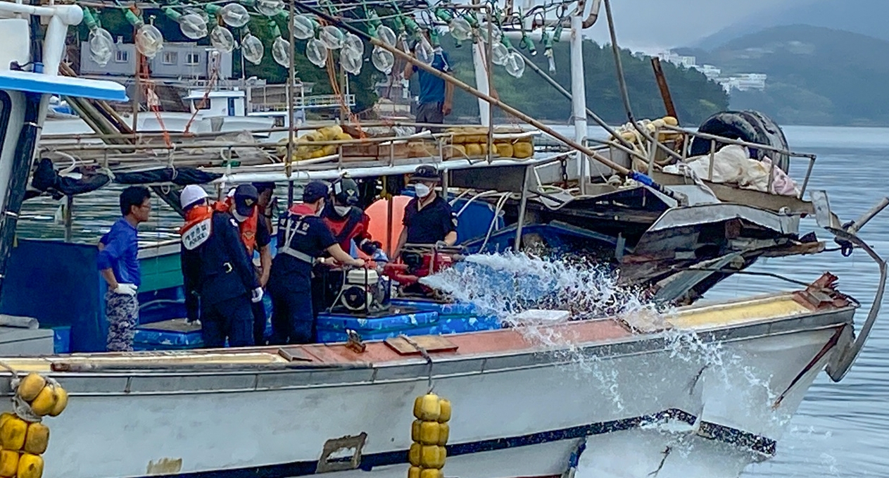 또한 B호 선체 일부파손으로 인해 기관실 및 어창이 침수되고 있어 배수펌프를 이용 배수작업을 실시하며 인근 조선소로 안전하게 이동 조치했다.