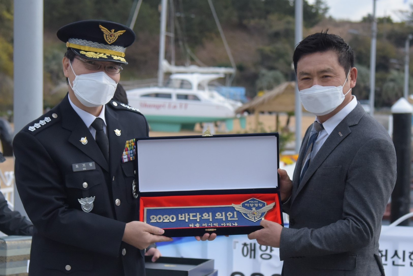 - 서귀포해양경찰서(서장 도기범)는 올해 “바다 의인”으로 선정된 수상레저업체 “리솜 퍼시픽 마리나”에 상장과 함께 기념패를 수여하였다고 18일 밝혔다. -