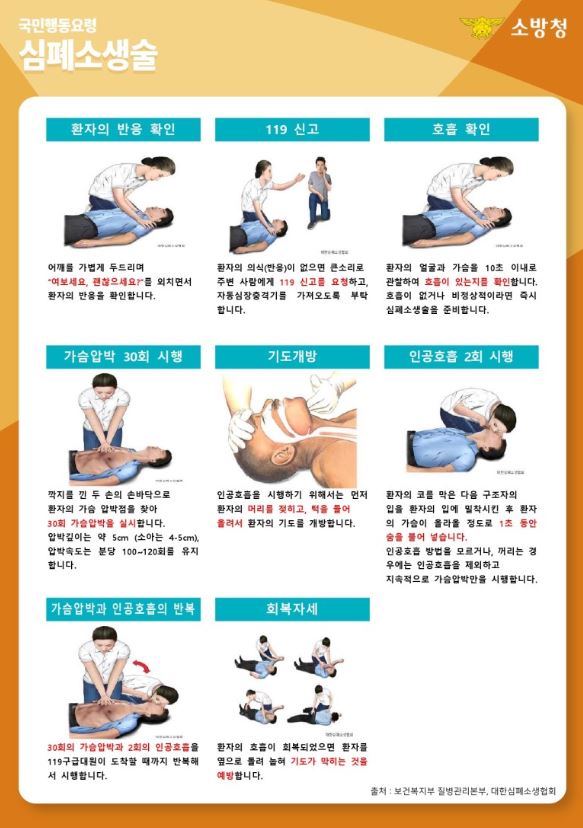 심폐소생술 순서에 대해 알아보자. 첫 번째로 의식 확인을 해야 한다. 환자에게 골절 및 내출혈 같은 식별되지 않은 부상이 있을 수 있으므로 환자를 흔들어서는 안 된다. 가볍게 쥔 주먹으로 목과 어깨 사이를 두드리며 “괜찮으세요?, 제 말 들리세요?" 라고 말하며 환자의 의식을 확인한다. 둘째 119 신고요청 및 자동제세동기를 가져다 달라고 요청해야 한다. 이때 주의할 점은 다수의 사람들에게 요청할 경우 서로에 미루어 신고를 하지 않는 경우가 있다. 그러므로 특정 사람의 옷 색깔, 악세사리 등을 지정하여 요청해야 한다.