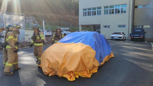사진 설명 고흥소방서(서장 박상진) 고흥119안전센터는 28일 고흥소방서 청사에서 특수화재진압용 방화담요 적...