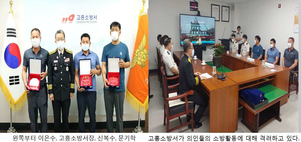 [고흥소방]=고흥소방서(서장 박상진)는 29일 소방서 소회의실에서 윤호21병원 화재 당시 인명구조 활동에 앞장서 소중한 생명을 구한 의인 5명에게 감사패를 수여했다.