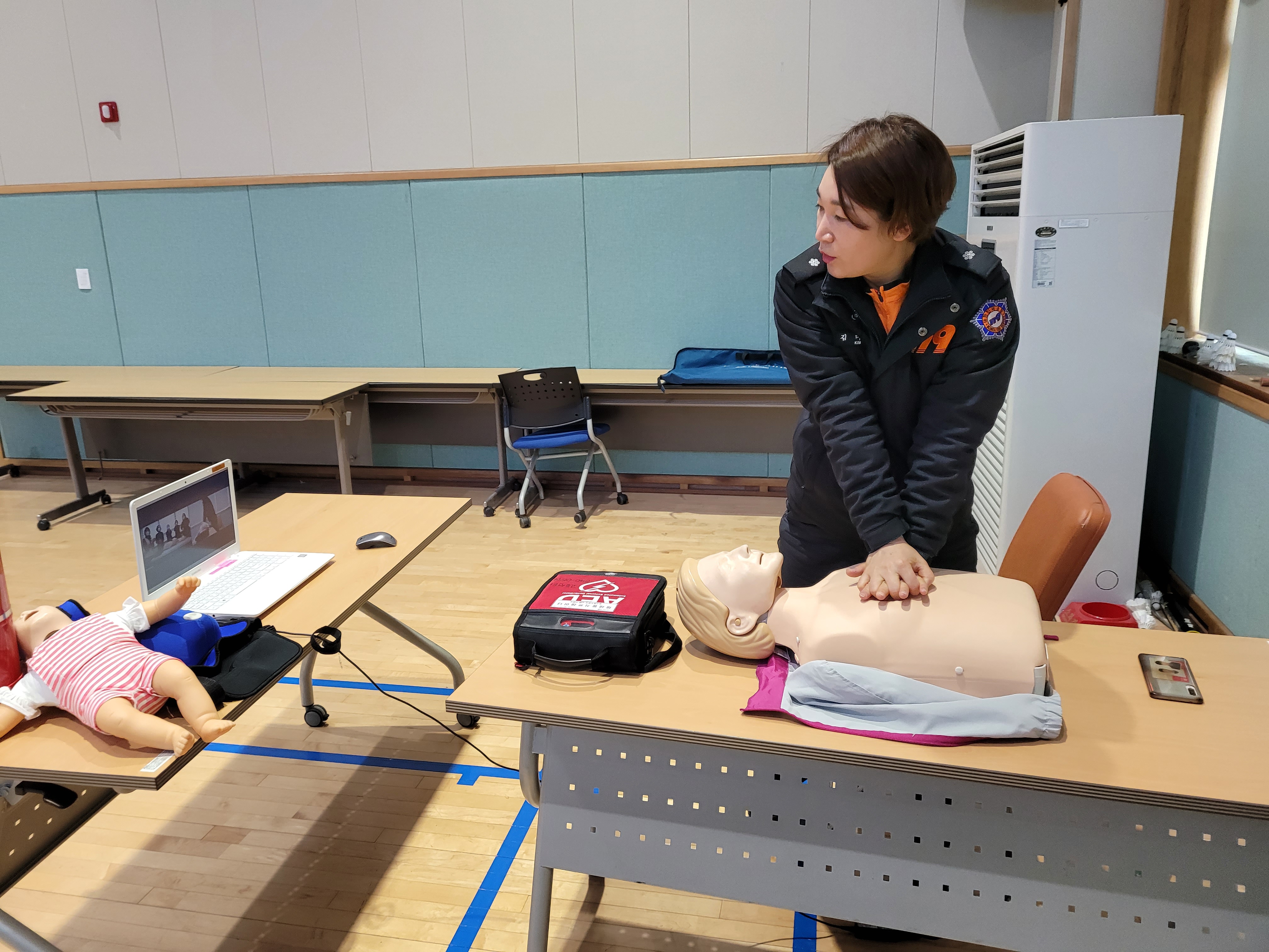 주요 교육내용으로 ▲소화기 사용법 ▲기도 폐쇄시 응급처치법 ▲심폐소생술 및 자동심장충격기 사용법 등이다.