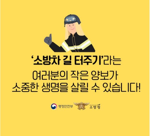 화재 현장, 구조 현장, 구급 현장 모두 1분 1초가 급한 상황이며, 몇 분의 지연이 인명, 재산 피해를 극대화 할 수도 있다. 출동 중인 소방차량 길 터주기는 어렵지 않다. ‘응급한 환자, 또는 불타는 화재 현장의 피해자가 남이 아닌 내가 될 수 있다’라는 마음으로, 양보의 미덕을 가져보자.