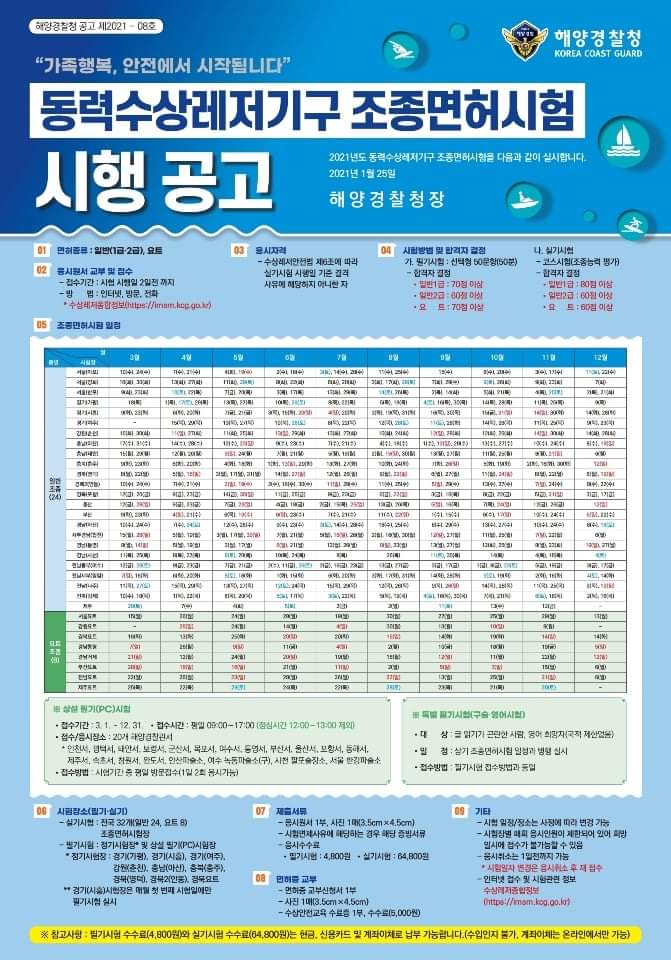 - 완도해양경찰서(서장 안성식)는 2021년 동력수상레저기구 조정면허 상설 PC필기시험을 오는 3월 2일부터 12월 31일까지 시행한다고 밝혔다. -