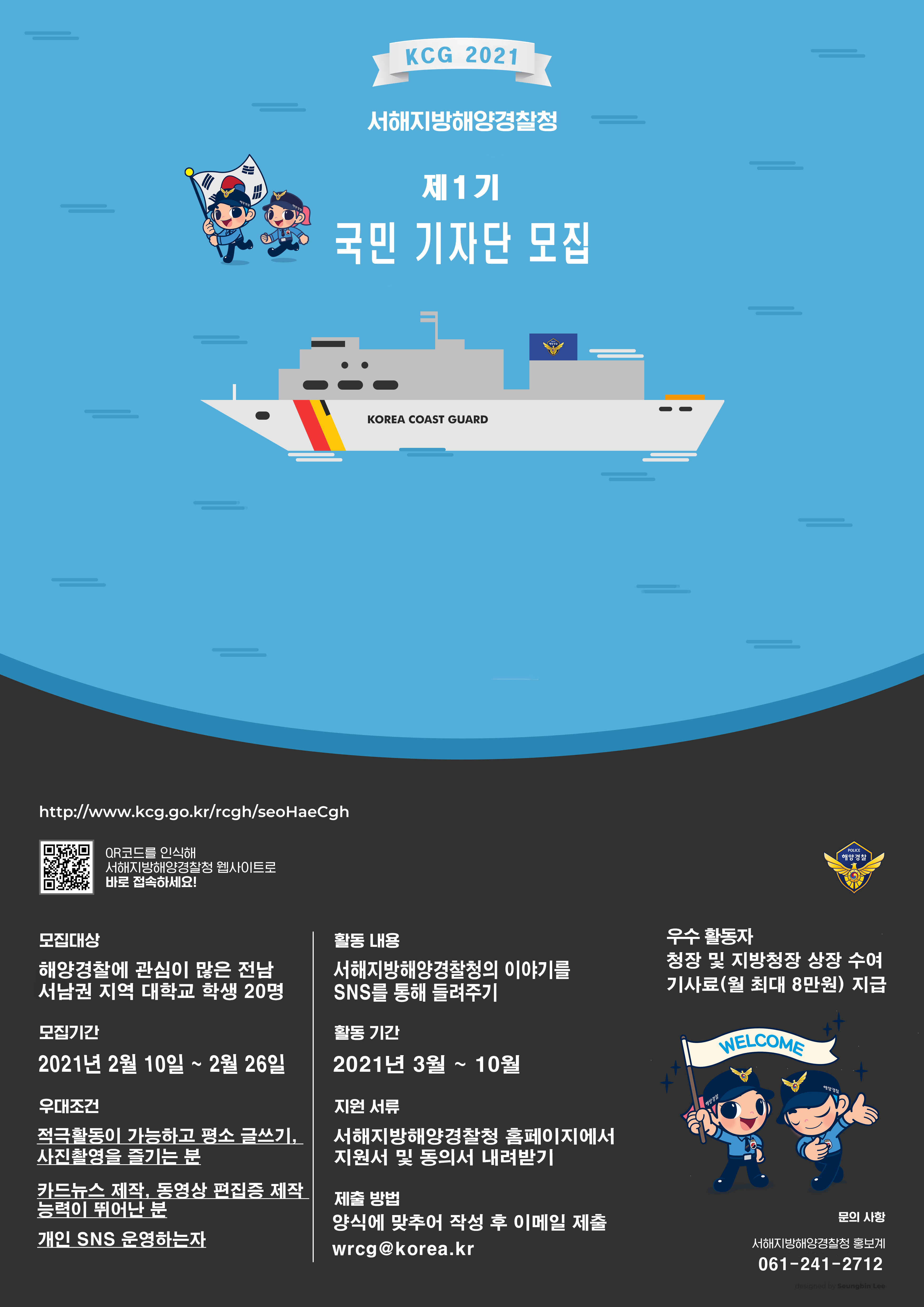 서해지방해양경찰청(청장 정봉훈)이 해경의 활동상을 국민들에게 생생히 전달할 ‘국민기자단’ 20명을 모집한다.