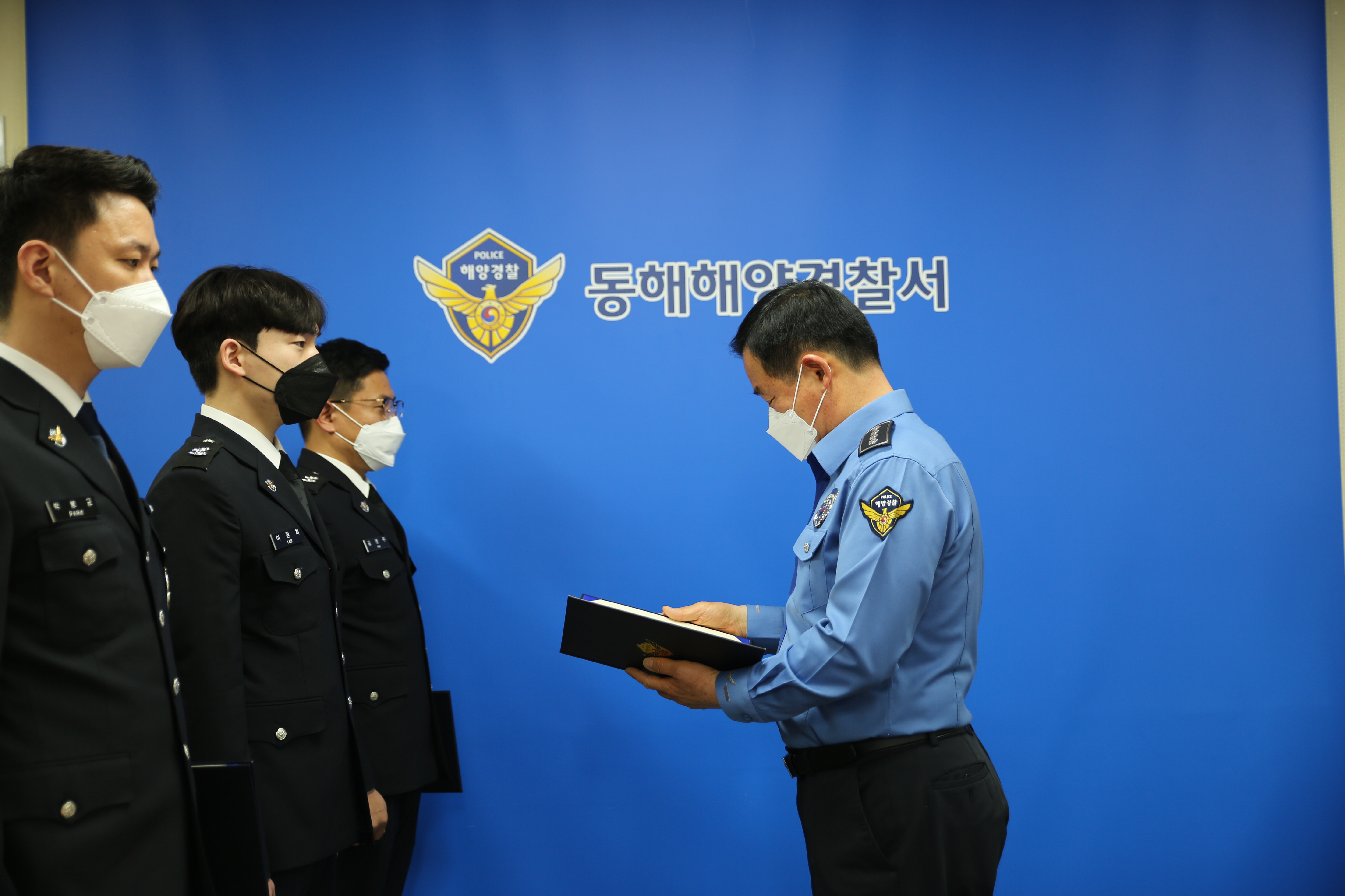 동해해경 정태경 서장은 승진자에 대한 계급장 부착과 함께 임명장을 수여하며 “코로나19로 인해 다수가 참석하는 승진임용식이 개최되지 못하고 각 부서별 자체 승진임용식을 가졌지만, 승진을 진심으로 축하한다”며, “국민으로부터 존경과 사랑을 받을 수 있도록 책임감을 가지고 안전한 바다 만들기에 최선을 다하는 해양경찰이 되어주기를 바란다.”라고 말했다.